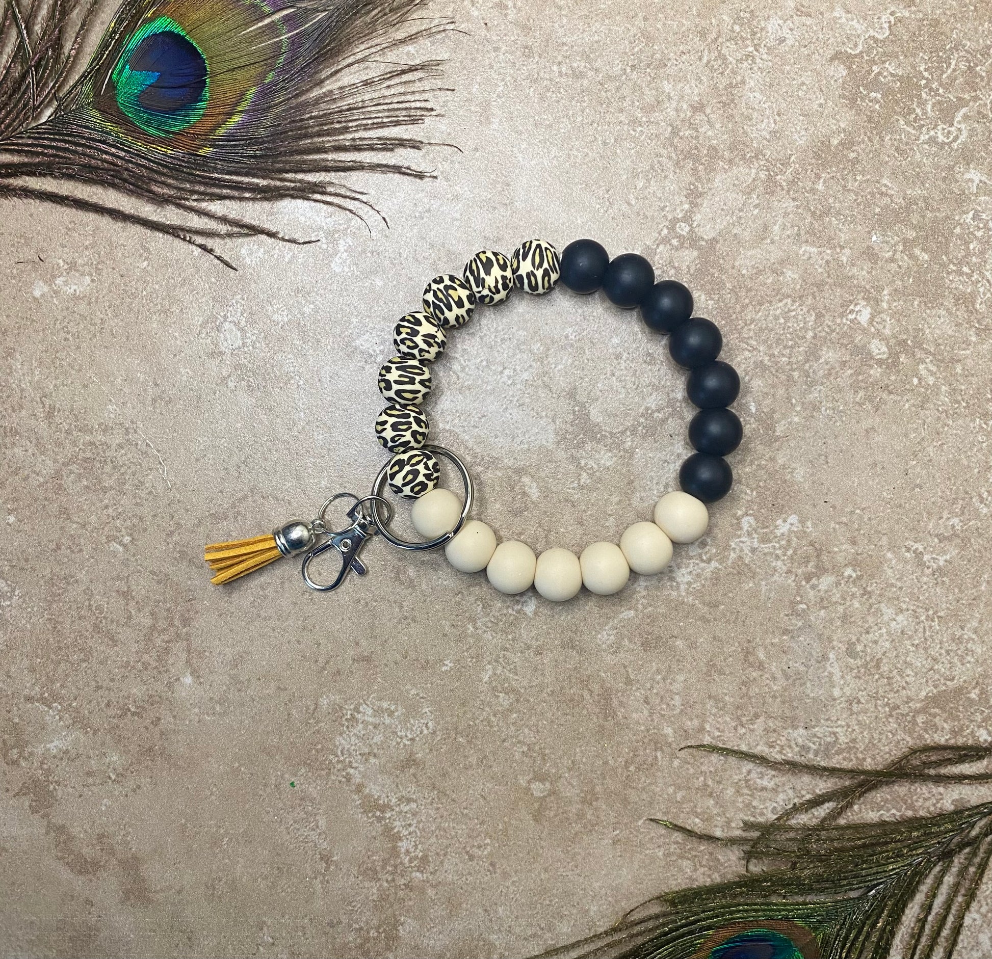 Silicone bead wristlet. Comes with a clip, tassel, and keychain. These are perfect to attach your keys or any other important item and have it right there attached to your body.